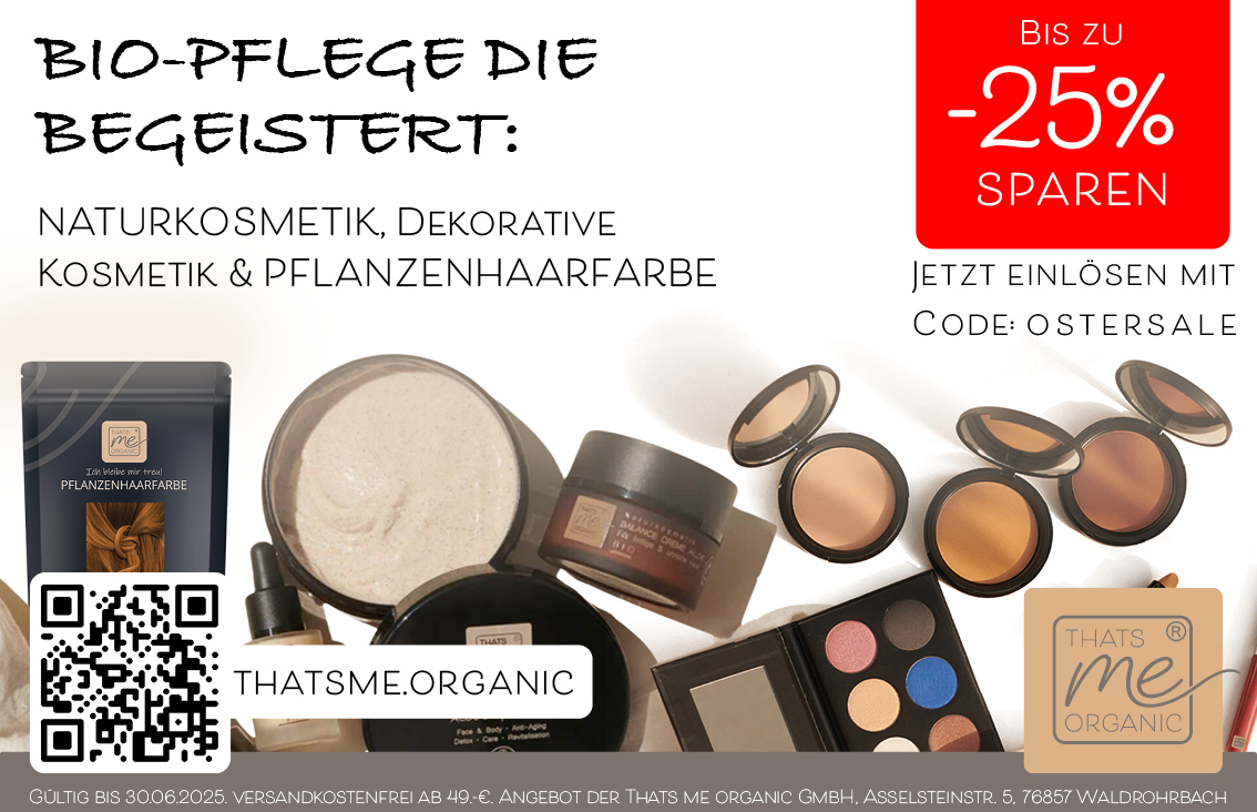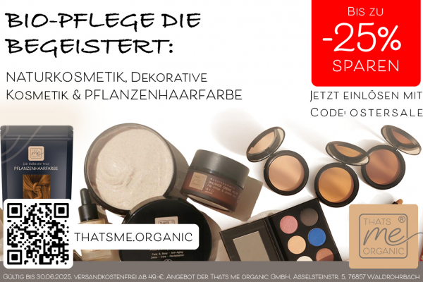 BIS ZU -25% SPAREN! BIO-PFLEGE DIE BEGEISTERT: NATURKOSMETIK, DEKORATIVE KOSMETIK & PFLANZENHAARFARBE Thats me organic GmbH Startdatum 07.04.2025 Ablaufdatum 30.06.2025 Code OSTERSALE Couponcode kopieren Coupon einlösen Coupon drucken!