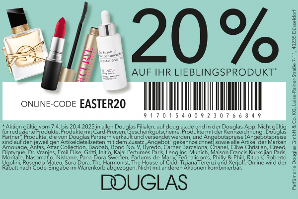 ERHALTE 20% AUF DEIN LIEBLINGSPRODUKT BEI DOUGLAS Douglas Startdatum 06.04.2025 Ablaufdatum 20.04.2025 Code EASTER20 Couponcode kopieren Coupon einlösen Coupon drucken!