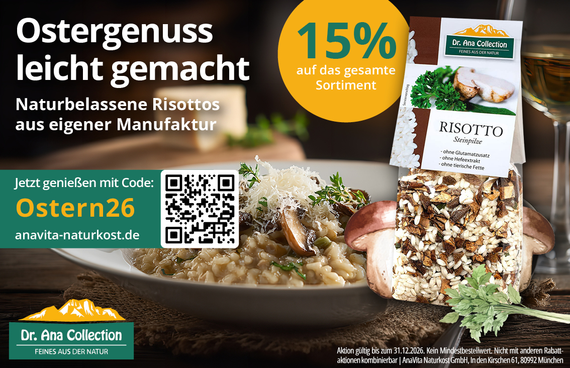 15% auf das gesamte Sortiment | Ostergenuss leicht gemacht! Naturbelassene Risottos aus eigener Manufaktur AnaVita Naturkost Startdatum 23.03.2026 Ablaufdatum 31.12.2026 Code Ostern26 Couponcode kopieren Coupon einlösen Coupon drucken! Endet in