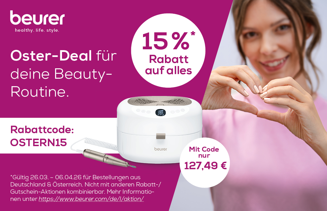 15%* Rabatt auf alles | Oster-Deal für deine Beauty-Routine. Beurer GmbH Startdatum 26.03.2026 Ablaufdatum 06.04.2026 Code OSTERN15 Couponcode kopieren Coupon einlösen Coupon drucken! Endet in