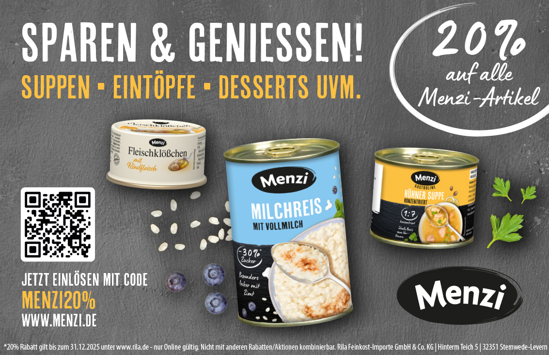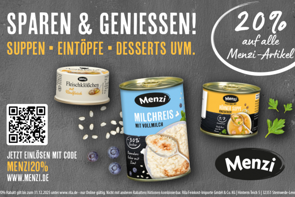 20% auf alle Menzi-Artikel - SPAREN & GENIESSEN! SUPPEN - EINTÖPFE - DESSERTS UVM. Rila Feinkost-Importe GmbH & Co. KG Startdatum 15.04.2025 Ablaufdatum 31.12.2025 Code MENZI20% Couponcode kopieren Coupon einlösen Coupon drucken! Endet in