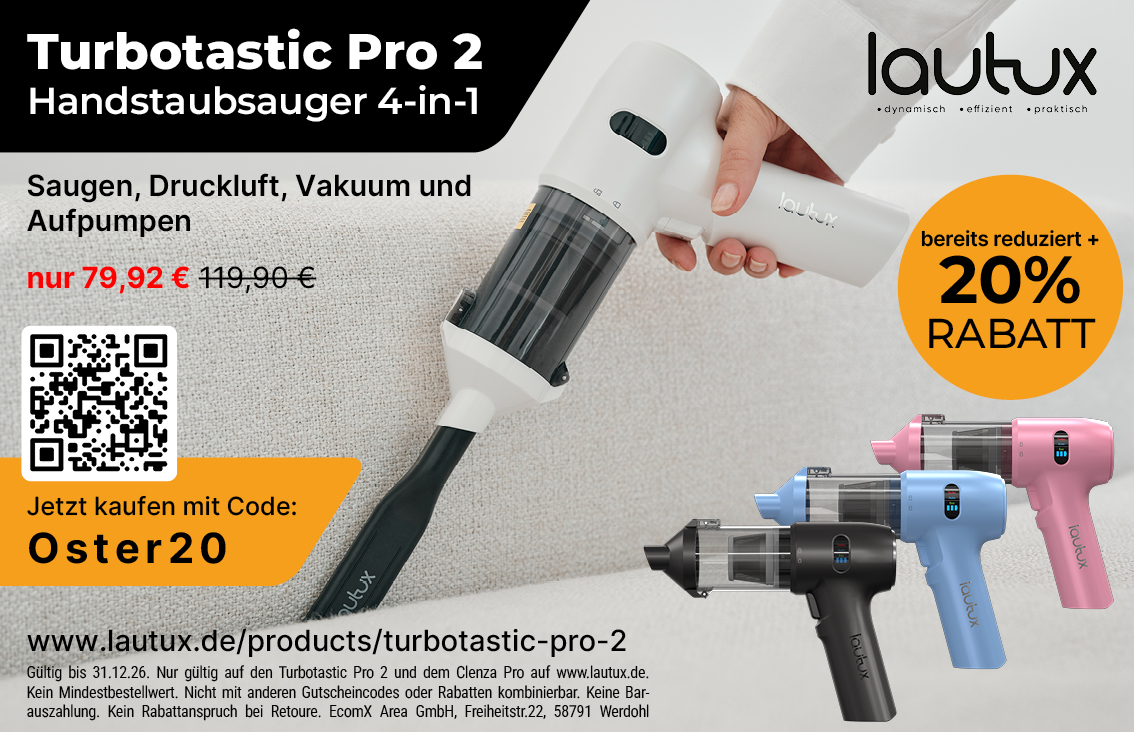 Nur gültig auf den Turbotastic Pro 2 und den Clenza Pro. www.lautux.de. Kein Mindestbestellwert. Nicht mit anderen Gutscheincodes oder Rabatten kombinierbar. Keine Barauszahlung. Kein Rabattanspruch bei Retoure.