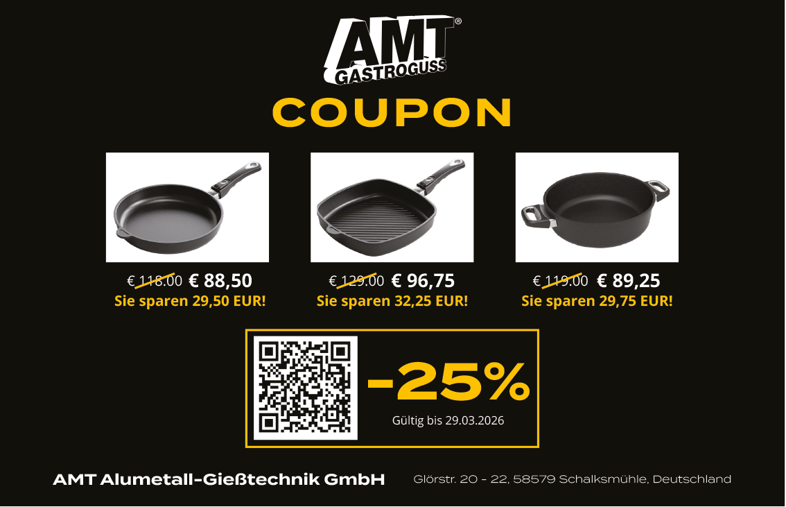-25% RABATT bei AMT AMT – Alumetall Gießtechnik GmbH Startdatum 20.03.2026 Ablaufdatum 29.03.2026 Kein Code notwendig Zum Angebot Coupon drucken! Endet in