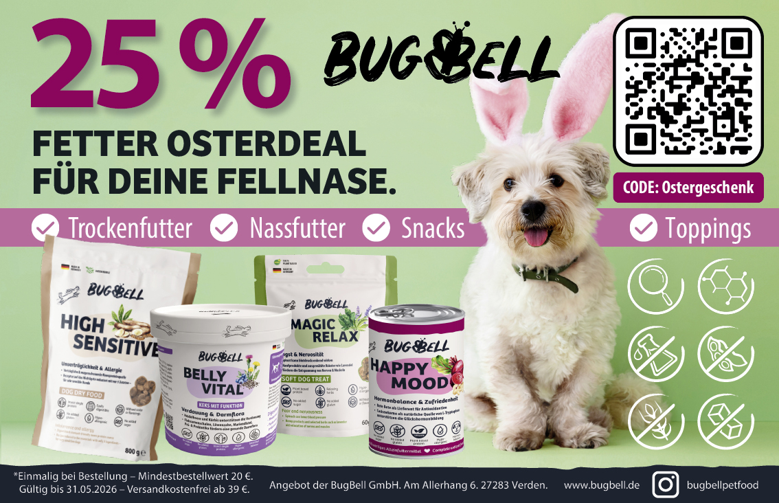 25% RABATT | FETTER OSTERDEAL FÜR DEINE FELLNASE. BugBell GmbH Startdatum 23.03.2026 Ablaufdatum 31.05.2026 Code Ostergeschenk Couponcode kopieren Coupon einlösen Coupon drucken! Endet in