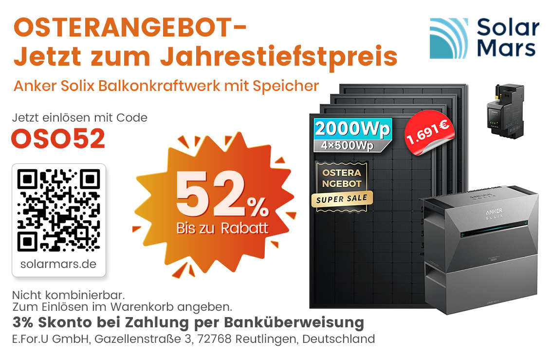 Bis zu 52%* Rabatt | OSTERANGEBOT- Jetzt zum Jahrestiefstpreis Anker Solix Balkonkraftwerk mit Speicher Jetzt einlösen mit Code OSO52 Solar Mars Startdatum 26.03.2026 Ablaufdatum 31.12.2026 Code OSO52 Couponcode kopieren Coupon einlösen Coupon drucken! Endet in