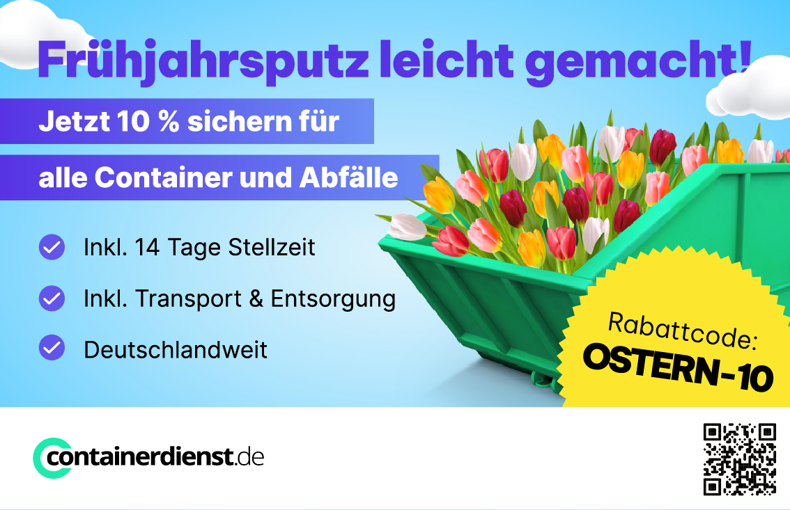 Frühjahrsputz leicht gemacht! Jetzt 10 % sichern für alle Container und Abfälle Zentek Services GmbH & Co. KG Startdatum 26.03.2026 Ablaufdatum 30.04.2026 inkl. 14 Tage Stellzeit, Transport & Entsorgung Deutschlandweit Code OSTERN-10 Couponcode kopieren Coupon einlösen Coupon drucken! Endet in