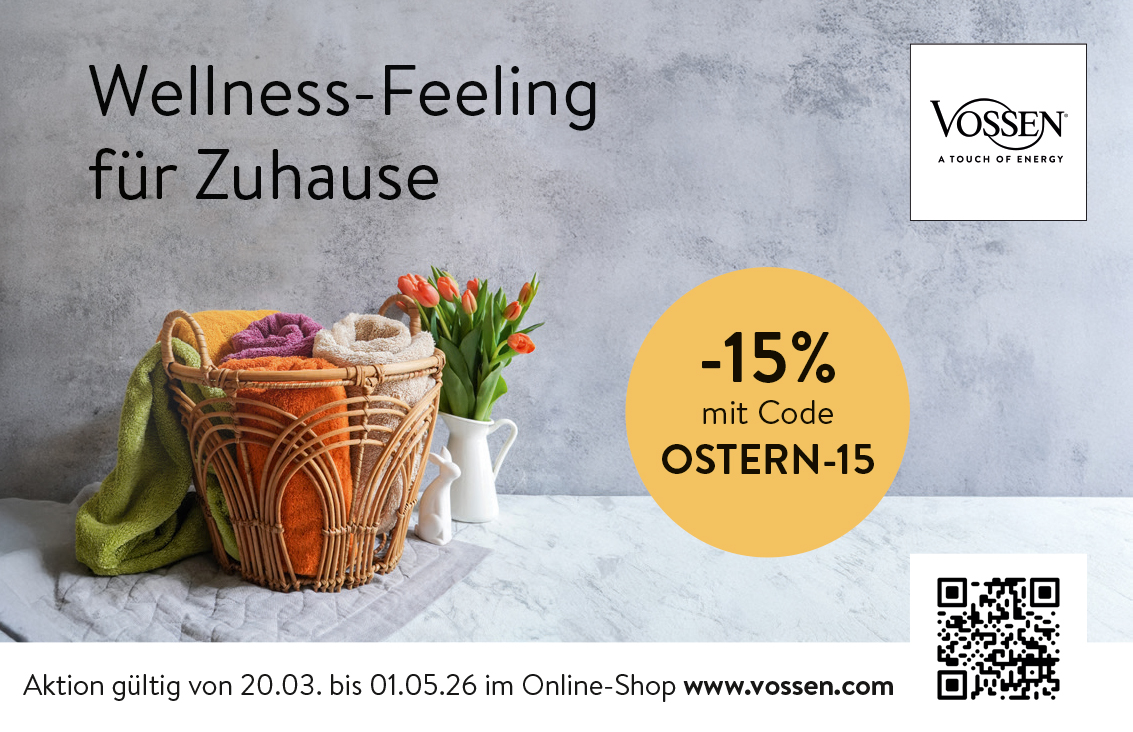 Wellness-Feeling für Zuhause | -15% mit Code OSTERN-15 VOSSEN GmbH & Co. KG Startdatum 26.03.2026 Ablaufdatum 01.05.2026 Code OSTERN-15 Couponcode kopieren Coupon einlösen Coupon drucken! Endet in