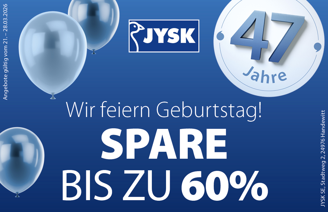Wir feiern 47 Jahre Geburtstag! SPARE BIS ZU 60% bei JYSK JYSK SE Startdatum 26.03.2026 Ablaufdatum 28.03.2026 Kein Code notwendig Zum Angebot Coupon drucken! Endet in