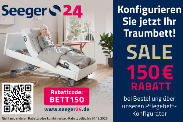 Konfigurieren Sie jetzt Ihr Traumbett! SALE 150 € RABATT bei Bestellung über unseren Pflegebett- Konfigurator Mehr Details Endet in