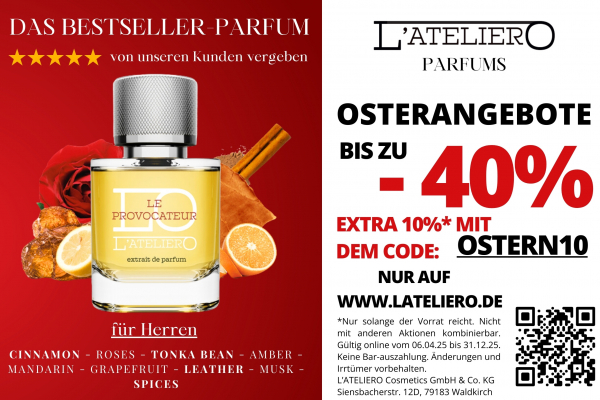 Bis zu -40% + Extra 10% Rabatt im Ostersale auf Luxus-Parfums für Damen & Herren! L'ATELIERO Parfums Mehr Details Endet in
