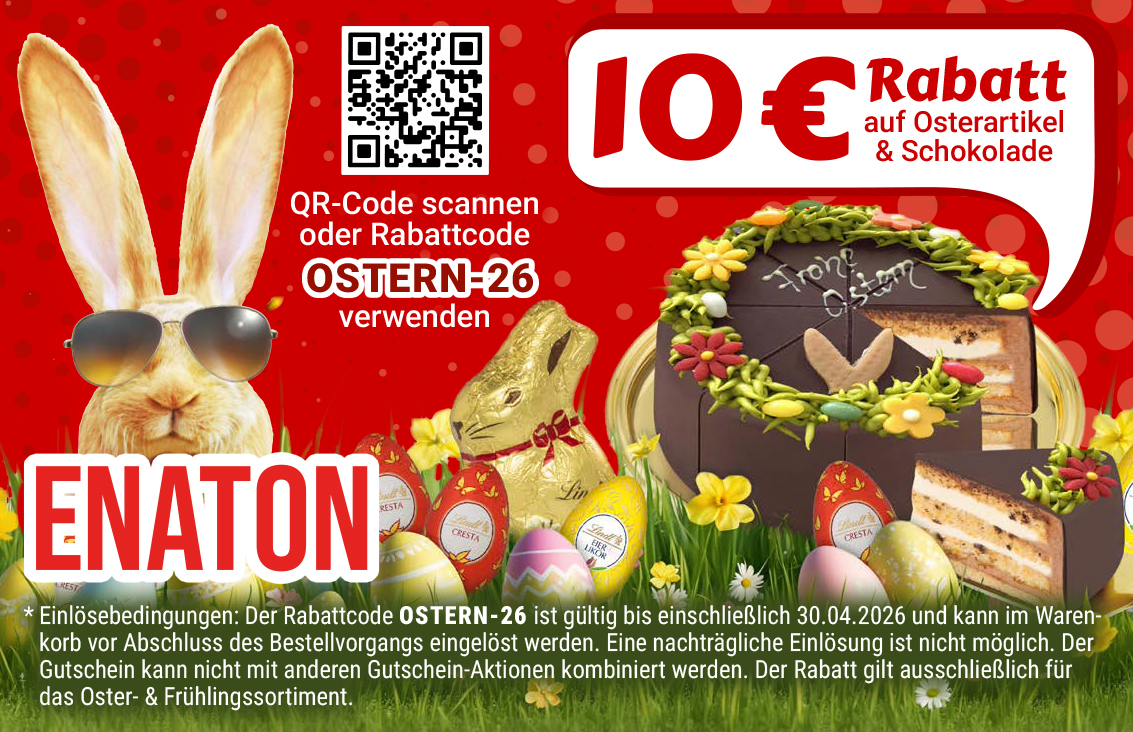 10€ Rabatt auf Osterartikel & Schokolade bei ENATION ENATON Startdatum 26.03.2026 Ablaufdatum 30.04.2026 Code OSTERN-26 Couponcode kopieren Coupon einlösen Coupon drucken! Endet in