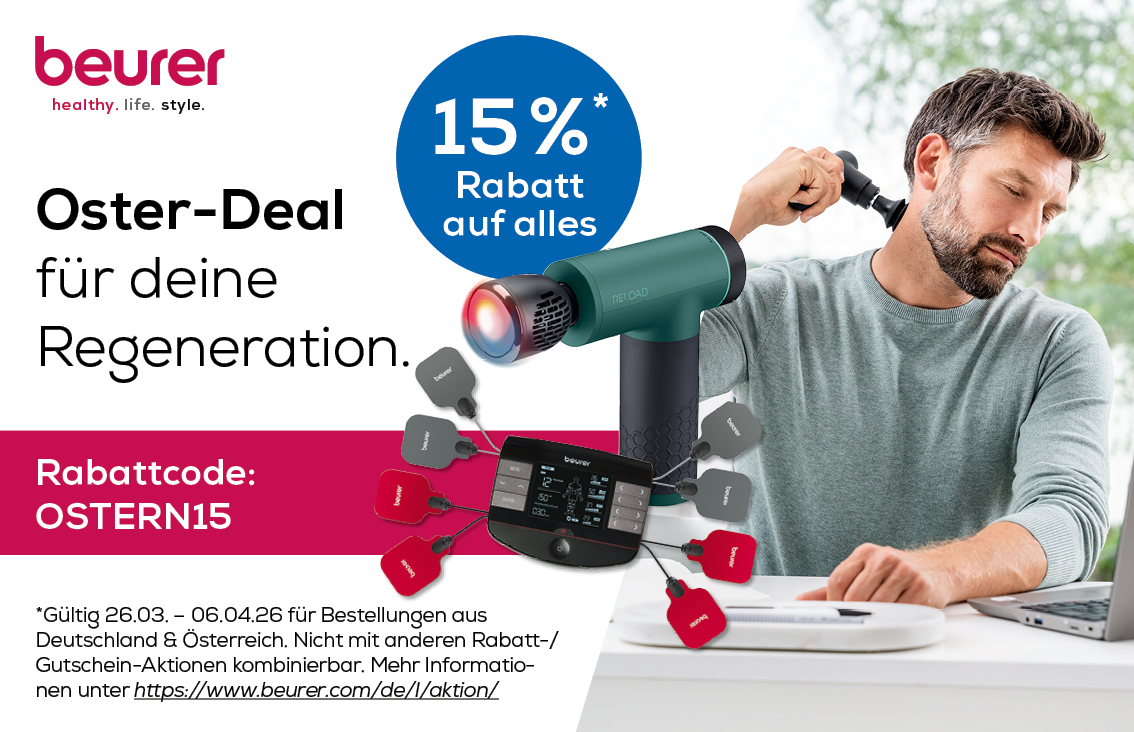 15%* Rabatt auf alles | Oster-Deal für deine Regeneration. Beurer GmbH Startdatum 26.03.2026 Ablaufdatum 06.04.2026 Code OSTERN15 Couponcode kopieren Coupon einlösen Coupon drucken! Endet in