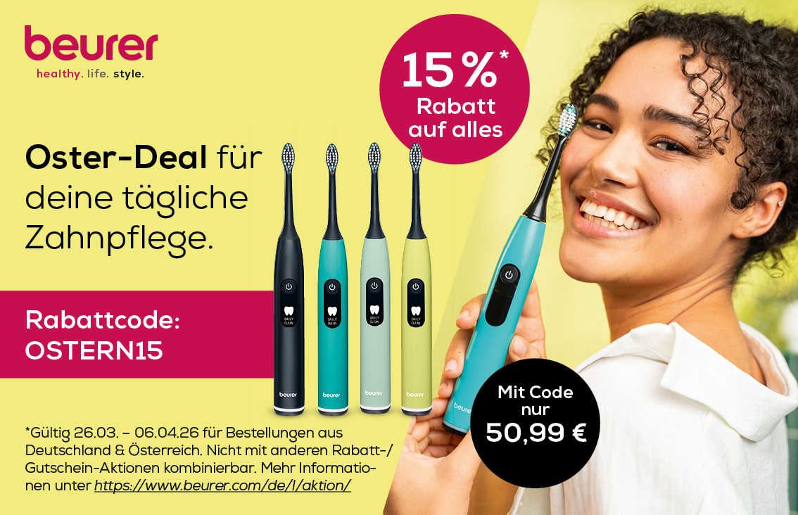 15%* Rabatt auf alles | Oster-Deal für deine tägliche Zahnpflege. Beurer GmbH Startdatum 26.03.2026 Ablaufdatum 06.04.2026 Code OSTERN15 Couponcode kopieren Coupon einlösen Coupon drucken! Endet in