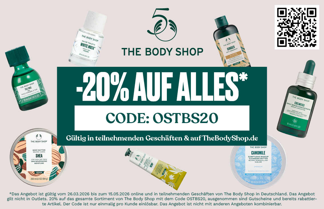 -20% AUF ALLES* | TheBodyShop.de THE BODY SHOP Startdatum 26.03.2026 Ablaufdatum 15.05.2026 Gültig in teilnehmenden Geschäften & auf TheBodyShop.de Code OSTBS20 Couponcode kopieren Coupon einlösen Coupon drucken! Endet in