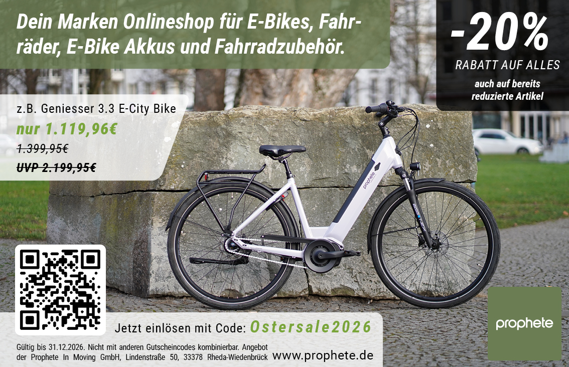 -20% RABATT AUF ALLES auch auf bereits reduzierte Artikel | Dein Marken Onlineshop für E-Bikes, Fahrräder, E-Bike Akkus und Fahrradzubehör.