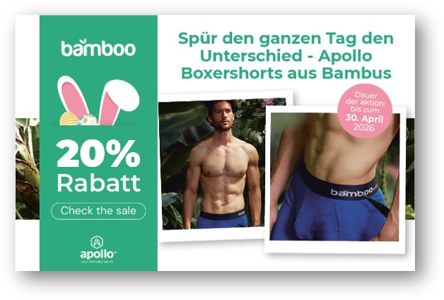 20% Rabatt | Spür den ganzen Tag den Unterschied - Apollo Boxershorts aus Bambus Angro B.V. Startdatum 26.03.2026 Ablaufdatum 30.04.2026 Kein Code notwendig Zum Angebot Coupon drucken! Endet in