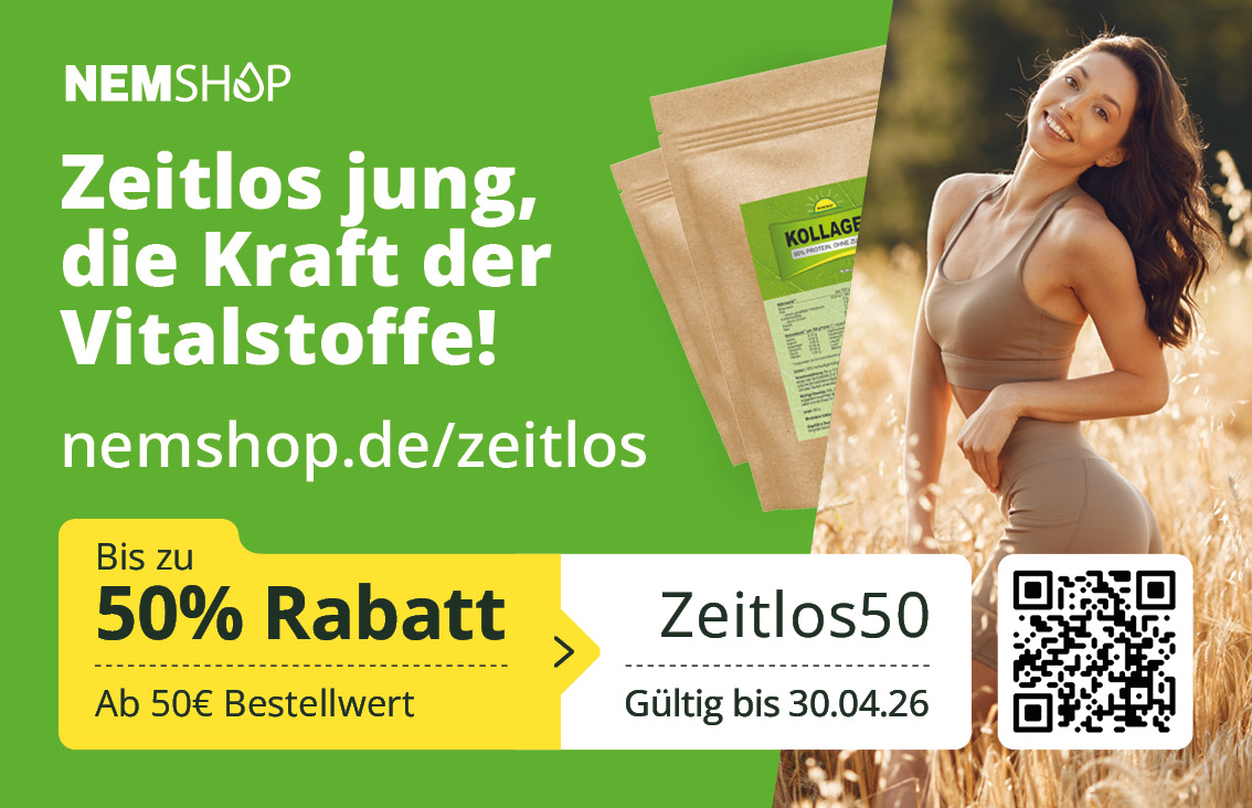 Bis zu 50% Rabatt | Zeitlos jung, die Kraft der Vitalstoffe! NEMSHOP Startdatum 23.03.2026 Ablaufdatum 30.04.2026 Code Zeitlos50 Couponcode kopieren Coupon einlösen Coupon drucken! Endet in