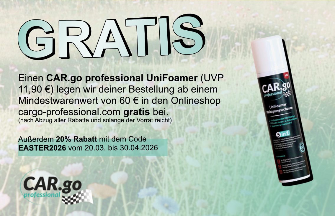 Sichere dir jetzt deinen gratis UniFoamer für alles, was Räder hat! Shoppe vom 20.03. bis 30.04.2026 für mindestens 60 € auf cargo-professional.com und der 5in1 Reinigungsschaum landet automatisch in deinem Warenkorb.
