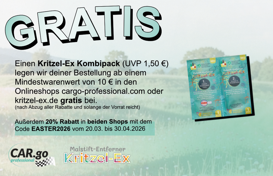 Sichere dir jetzt dein gratis Kritzel-Ex Kombipack! Shoppe einfach im Zeitraum vom 20.03. bis 30.04.2026 auf kritzel-ex.de oder cargo-professional.com und wir schenken dir ab einem Einkaufswert von 10 € ein Kombipack dazu. Das Beste daran: Du musst keinen Code eingeben, denn das Geschenk wird deinem Warenkorb ganz automatisch hinzugefügt.
