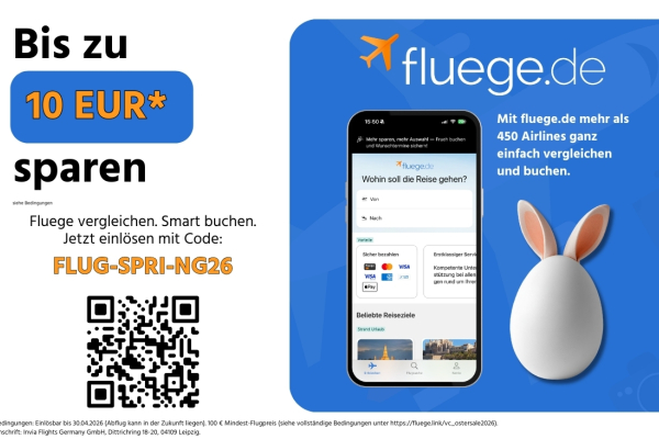 Bis zu 10 EUR* sparen | Mit fluege.de mehr als 450 Airlines ganz einfach vergleichen und Smart buchen. Mehr Details Endet in