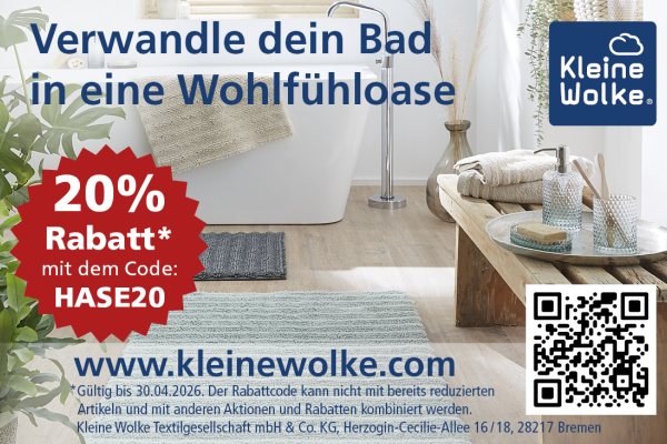 Erhalte mit dem Rabattcode „HASE20“ sagenhafte 20% Rabatt im Onlineshop von Kleine Wolke.* Mehr Details Endet in