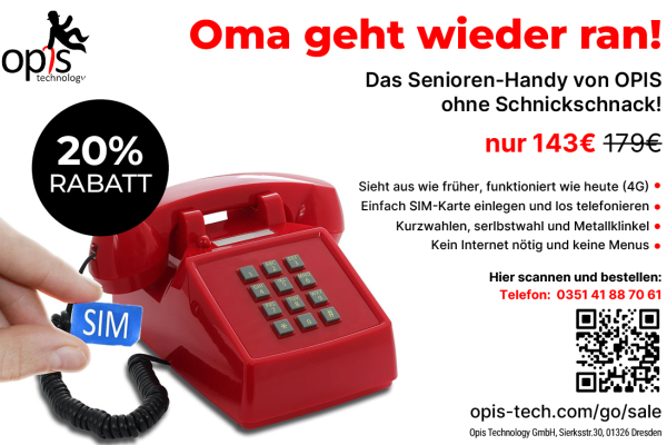 20% RABATT | Oma geht wieder ran! Das Senioren-Handy von OPIS ohne Schnickschnack! Mehr Details Endet in