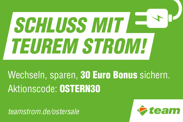 SCHLUSS MIT TEUREM STROM! Wechseln, sparen, 30 Euro Bonus sichern. Aktionscode: OSTERN30 Mehr Details Endet in
